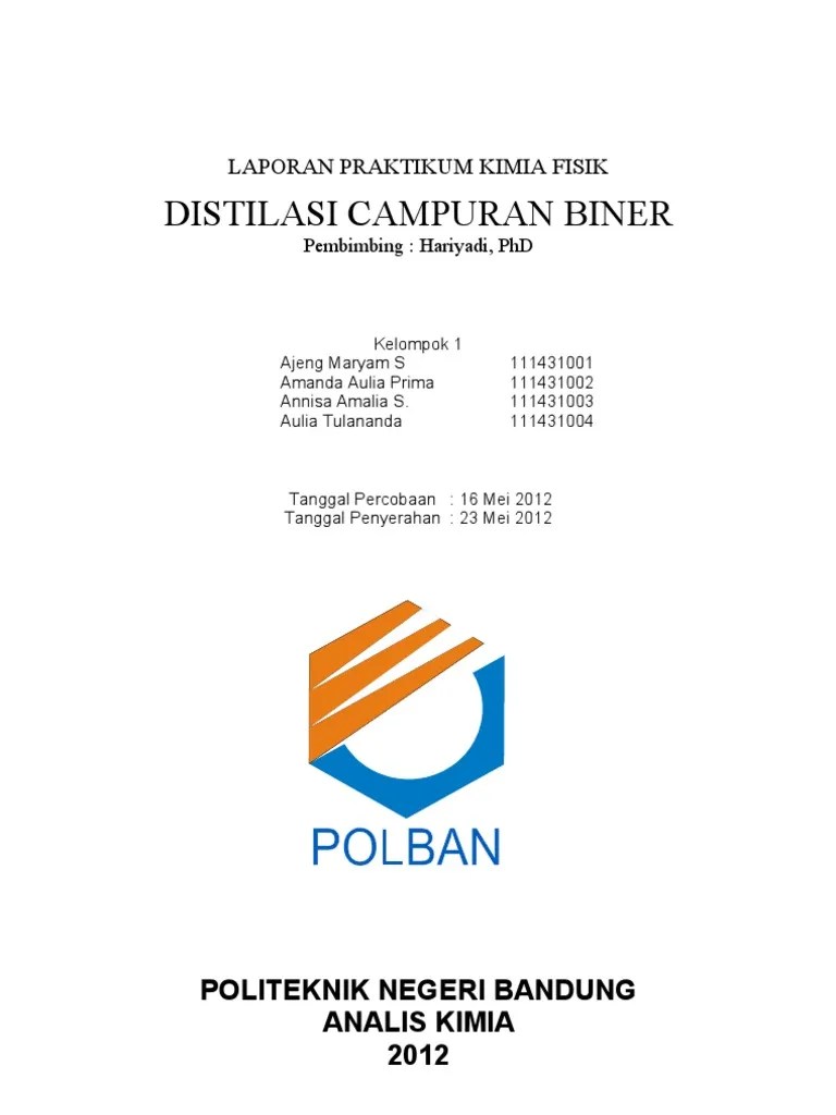Laporan praktikum destilasi (bubble cap distilation column) disusun untuk memenuhi mata kuliah pilot plant semester ganjil program diploma iii jurusan . Destilasi adalah suatu metode pemisahan hukum raoult berdasarkan perbedaan titik didih. Pada akhir percobaan mahasiswa diharapkan paham dan terampil dalam :. Dapat membuat laporan praktikum secara tertulis dengan baik dan benar. Memisahkan dua komponen cairan yang memiliki titik.